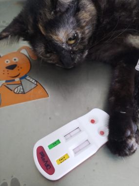 Montse hat jetzt ein Gerät in der Praxis, das Fiv und Felv Tests durchführen kann.