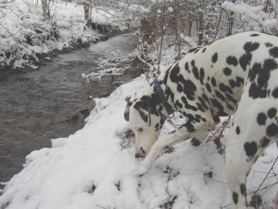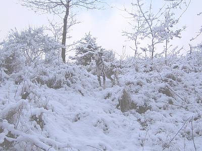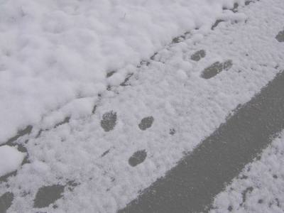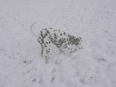 Tja da geht die Türe auf und der Hund guckt doof. Schnee, ganz viel Schnee und dazu noch Domingos erster richtiger Schnee in dem er bleibende Spuren hinterlässt.