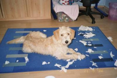 Außerdem hat Mama gemeint, so ein bisschen Erziehung kann auch nicht schaden. Also hat sie uns zum Junghunde-Kurs angemeldet. War natürlich ein Klacks für mich. Für ein Leckerchen mach ich alles – sogar bei Fuß laufen. Die Hundetrainerin hat dann ab und zu lustige Wettrennen veranstaltet (um Hütchen, durch Tunnel, usw.). Das war ein Spaß! Ich will ja nicht angeben, aber wir sind immer Erste geworden, meine Mama und ich. Wenn Mama mal nicht mehr konnte, habe ich halt ein wenig nachgeholfen (zieh, zerr,...).