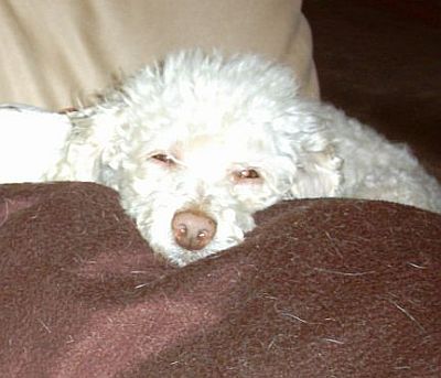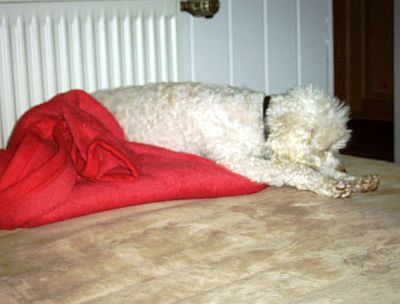 Ich durfte mit ins Bett, toll ich habe mich ganz fest an mein Frauchen gekuschelt.
