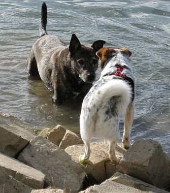heute abend ist Niko nun eine Woche bei uns, und er macht sich ganz prima! Er ist ein sehr lieber, anhänglicher und ruhiger Hund, der nun - da er langsam auftaut - auch ein wenig frecher wird und ich habe ihn inzwischen auch bellen gehört! Er liebt alles und jeden (außer Autos, insbesondere im Dunkeln, vor denen hat er ein wenig Angst), spielt mit anderen Hunden und war sogar schon ohne jede Aufforderung unsererseits im Rhein schwimmen, nachdem er drei anderen Hunden beim Schwimmen zugeschaut hatte. Auch die Eltern und Schwiegereltern fanden ihn natürlich sehr süß und liebenswert.