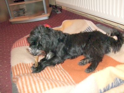 Man, war das´n Akt! Aber nun waren wir endlich zu Hause. So, erstmal raus aus der Box. Kurze Gassirunde und ab ins Warme. Komisch. Wo war denn der andere Hund, von dem mir so viel erzählt worden ist? Na egal. Erstmal alles erkunden. Hey, alles da! Spielzeug, lecker Essen, weiche Schlafgelegenheiten…man weiß gar nicht, was man zuerst machen soll. Die Entscheidung wurde mir dann abgenommen. Es gab einen mit Hundeschokolade gefüllten Kauknochen.