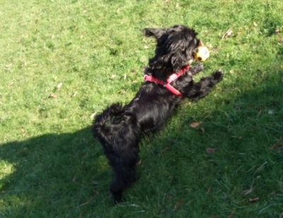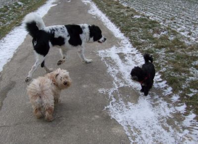 Ohne Leine bin ich auch schon gelaufen. Ist gewöhnungsbedürftig, aber echt schön. Auf manche Kommandos höre ich schon. Und meinen ersten Schnee habe ich hier auch schon erlebt. Sah eher aus wie Puderzucker. Teddys Kumpel Nemo habe ich auch schon kennen gelernt.