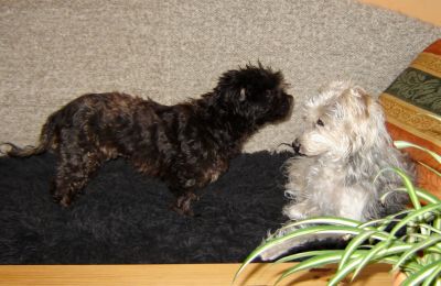 Meine neue große Schwester baggert mich mittlerweile auch schon mal zum Spielen an. Draußen sind wir uns sowieso schon einig, immer neben - oder hintereinander her und gleichzeitig markieren............. Wenn uns draußen Hundekumpel begegnen und die kommen mich nicht begrüßen, sondern laufen einfach weiter.......... -unverschämt -dann muß ich mittlerweile auch schon mal laut schimpfen!!!