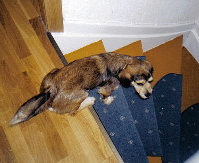 Da ich von Anfang an keine Treppen stieg, wurde ich die ersten zwei Tage schön getragen! Bis unsere Steffi meiner Mama doch ein paar Tips am Telefon gab, wie sie mich doch zum Treppensteigen „überreden“ konnte. Mit Leckerlies!!! Und meine „Fresssucht“ brachte mich tatsächlich dazu!