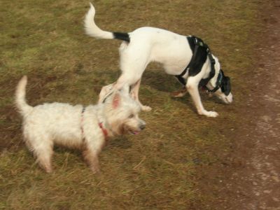 Ich hab jede Menge neue Hundefreunde kennen gelernt. Aber meine allerbeste Freundin ist „Shanty“, eine Westi-Hündin. Ein Wirbelwind hoch 3. Und obwohl sie viel kürzere Beine hat als ich, ist sie ganz schön schnell unterwegs wenn wir zusammen über die Felder und durch Pfützen rennen. Wenn wir es ganz gut drauf haben, sieht sie danach immer so aus: