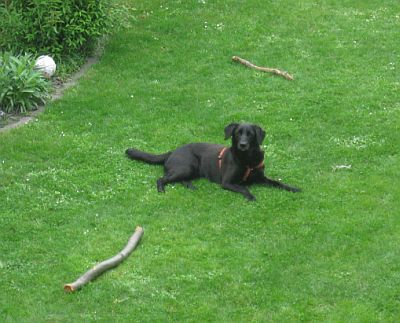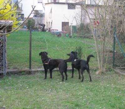 Später sind wir auf einem großen Platz ausgestiegen, die Frau, die meine Leine hielt und ich. Da gab es ganz viel zu schnuppern und zu gucken. Auf einmal kamen Leute mit einem schwarzen Hund, der lief auf uns zu. Toll, dachte ich Hunde gibt’s hier auch. Aber Moment mal, die Leute kenne ich doch, mit denen bin ich hergekommen, und den Hund hab ich schon im Auto gerochen. Das ist also mein neues Rudel! Den Hund fand ich ganz nett aber irgendwie schien er Angst vor mir zu haben. Wir gingen ein Stück spazieren und kamen dann durch ein Tor. Dahinter durfte ich von der Leine und konnte endlich rennen, durch die Einfahrt in den Hof in den Garten und wieder zurück. Das hat mir gut gefallen. Ben, so heißt mein neuer Hundebruder lief immer mit. Wir haben gespielt und gezankt, aber irgendwie war ich ihm nicht so geheuer. Es gibt hier sogar einen kleinen Teich aus dem haben wir Wasser getrunken und natürlich bin ich gleich reingefallen weil ich einen Schritt zu weit vor gegangen bin. Das war mir total peinlich aber es hat keiner gelacht. Herrchen hat mich rausgezogen und Frauchen hat mich abgetrocknet. Später durften wir sogar ins Haus, das war aufregend. Alle sagten immer „runter“ zu mir, so dass ich zuerst dachte, das wär mein neuer Name. Aber die meinten wohl ich sollte nicht an allem hochsteigen und nicht an jedem hochspringen. Das fand ich blöd, denn wenn man hochsteigt sieht man viel mehr. Aber ich bin ja ein kluger Hund und mit der Zeit habe ich vieles begriffen. Sogar das mit dem Körbchen. Die ersten paar Tage lag ich immer nur auf dem Boden oder auf einem Teppich, aber dann hab ich mal so ein Körbchen ausprobiert, mhh, so kuschelig, bin sofort eingeschlafen.