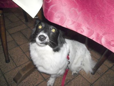 Dann nahm das Schicksal seinen Lauf! Während Herrchen und Frauchen sich vor ein Futterhaus (Ich meine so ein Haus, wo man sich etwas zu essen oder zu trinken bringen zu lassen kann. Gegen Bezahlung natürlich.) niederließen, bewachte ich unseren Tisch. Schließlich gehört sich das ja so für einen Hund, Wuff. Wir saßen gerade ein paar Minuten dort, als eine junge Frau mit einer weißen Schürze und einem riesigen Teller in der Hand auf uns zu gestürmt kam. Man, habe ich mich erschrocken!