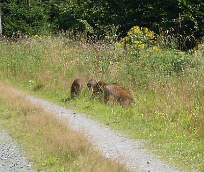 Jeden Tag sind wir gewandert bergauf und bergab. Zu Anfang war es mir etwas unheimlich überall so viele große dunkle Bäume, und dann nach der nächsten Biegung stehen plötzlich am Wegesrand auch noch vier braune Ungeheuer. Keinen Schritt bin ich mehr weitergegangen, bis mein Herrchen diese unheimlichen Wesen in die Flucht geschlagen hat.