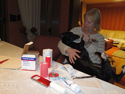 Wenn ich Frauchen so jammervoll angucke, ist Herrchen ganz schnell und sucht alles für meinen „kleinen“ Schlafensgehenverband zusammen.