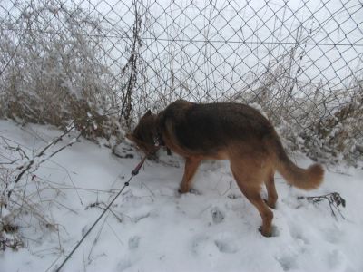 Während meine Menschen den Schnee wegschippen, warte ich darauf, daß meine Leckerli-Lieferantin aus dem Nachbarhaus auftaucht.