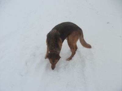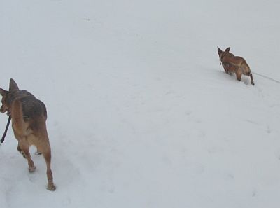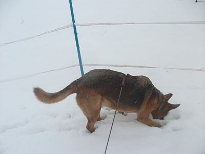 Sahra ist mit ihren kürzeren Beinchen ganz tief im Schnee eingesunken.