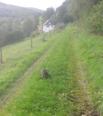 Natürlich sind wir dann auch wieder los und sind gelaufen und gelaufen. Ich habe gar nicht gemerkt wie viel. Unsere Juniorfrauchen meinten dann aber, dass wir in den 3 ½ Tagen ca. 50 km unterwegs gewesen wären. Und unsere längste Strecke über 20 km ging und wir dabei fast 300 Höhenmeter überwunden haben. An diesem Tag waren wir 8 h am Stück unterwegs. Vorsichtshalber hatten unsere Juniorfrauchen einen Rucksack mitgenommen, falls ich schlapp mache. Aber HALLO. Ich bin gerade mal 10 Jahre. Wer erzählt denn das Hunde mit 10 schon alt sind. Also ich mit Sicherheit nicht. Ich bin selbstverständlich alles gelaufen. Okay zugegeben ein bisschen musste ich schon an meine Kraftreserven gehen. Aber mal ehrlich, ich habe jetzt gelernt, dass wir wirklich nur am Rand des Sauerlands wohnen und es noch viel mehr Wald und noch mehr und vor allem größere Berge gibt. Aber wenn man erst mal oben ist, ist die Aussicht wunderschön. Ist es nicht einfach schön den Blick in die Ferne schweifen zu lassen und all seine Sorgen zu vergessen?
